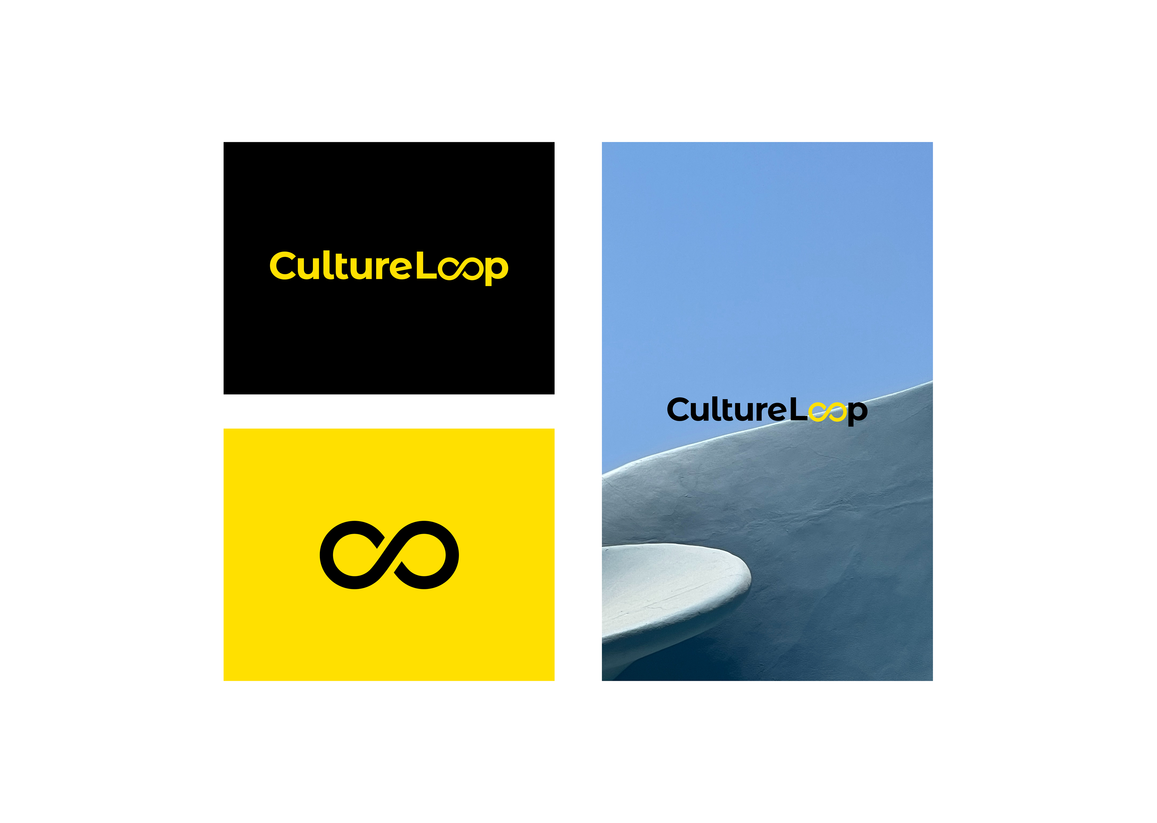 The visual identity is centered around a modern, clean design, with a striking black and yellow color palette that conveys energy, confidence, and innovation. The infinity loop, integrated into the wordmark, serves as a powerful symbol of continuous growth and collaboration—core values of Culture Loop. The choice of a sleek, sans-serif typeface adds a sense of stability and modernity, complementing the overall minimalist aesthetic.